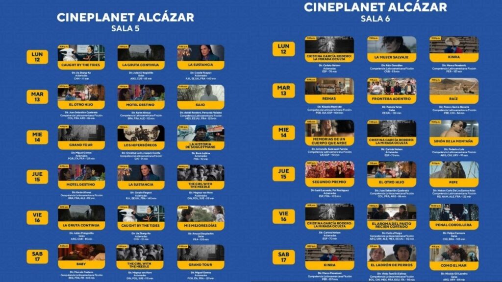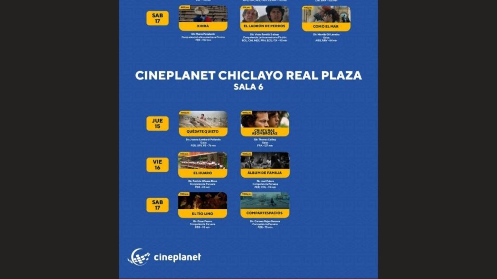 De acuerdo con lo que se lee en el portal web del Festival de Cine de Lima, el Cineplanet Alcázar, pondrá a su disposición dos salas, donde se proyectarán diferentes películas hasta este sábado 17 de agosto.
