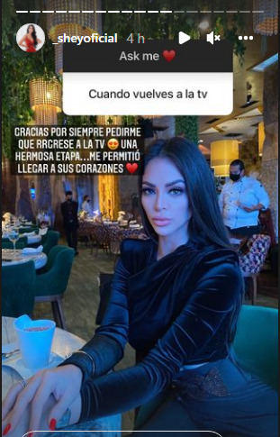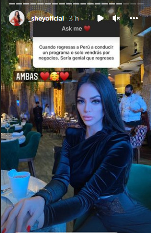 Ahora, la exchica reality Sheyla Rojas, sorprende al anunciar su regreso a la televisión peruana mediante su cuenta de Instagram. En esta red social, la modelo contestó a algunas de las preguntas de sus seguidores a través de las historias.