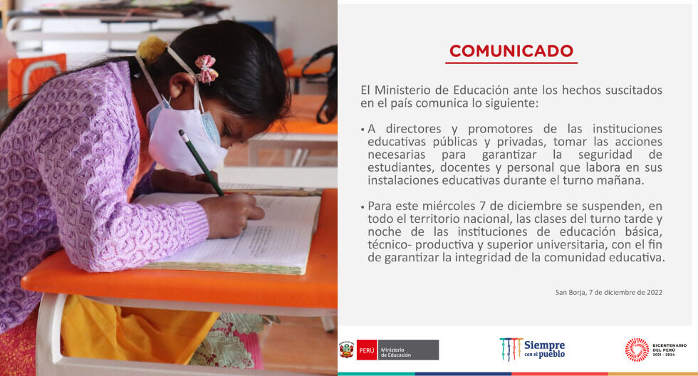 Además, se suspendieron en todo el Perú las clases en los turnos tarde y noche, en este miércoles 7 de diciembre. Esto aplica para las instituciones de educación básica, técnico-productiva y superior universitaria.