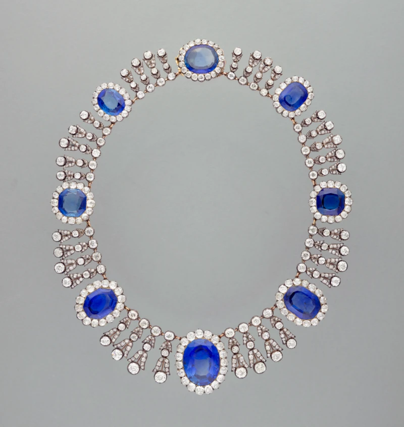 Los ladrones también se llevaron el valioso collar y los pendientes de zafiro que usaron estas dos monarcas. Elaboradas con zafiros, diamantes y oro de Sri Lanka, fueron adquiridas por el rey Luis Felipe (entonces duque de Orleans) para Hortensia de Beauharnais. Ambas reinas inmortalizaron estas joyas en varios retratos, como el de María Amelia pintado por Louis Hersent en 1836. El collar en sí, que consta de ocho zafiros y 631 diamantes engastados en oro, fue adquirido por el Gobierno francés en 1985 de la colección de la casa de Orleans. Aún se desconoce la identidad del joyero y de quien encargó originalmente el diseño.